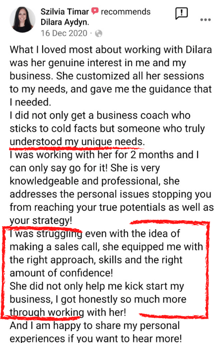 "I didn't only gain knowledge, but also a lot of confidence that I didn't really have before. I never had the courage to ask for money for my services, and that actually changed when I started working with Dilara" Szilvia Timar, Mindfulness & Meditation Coach