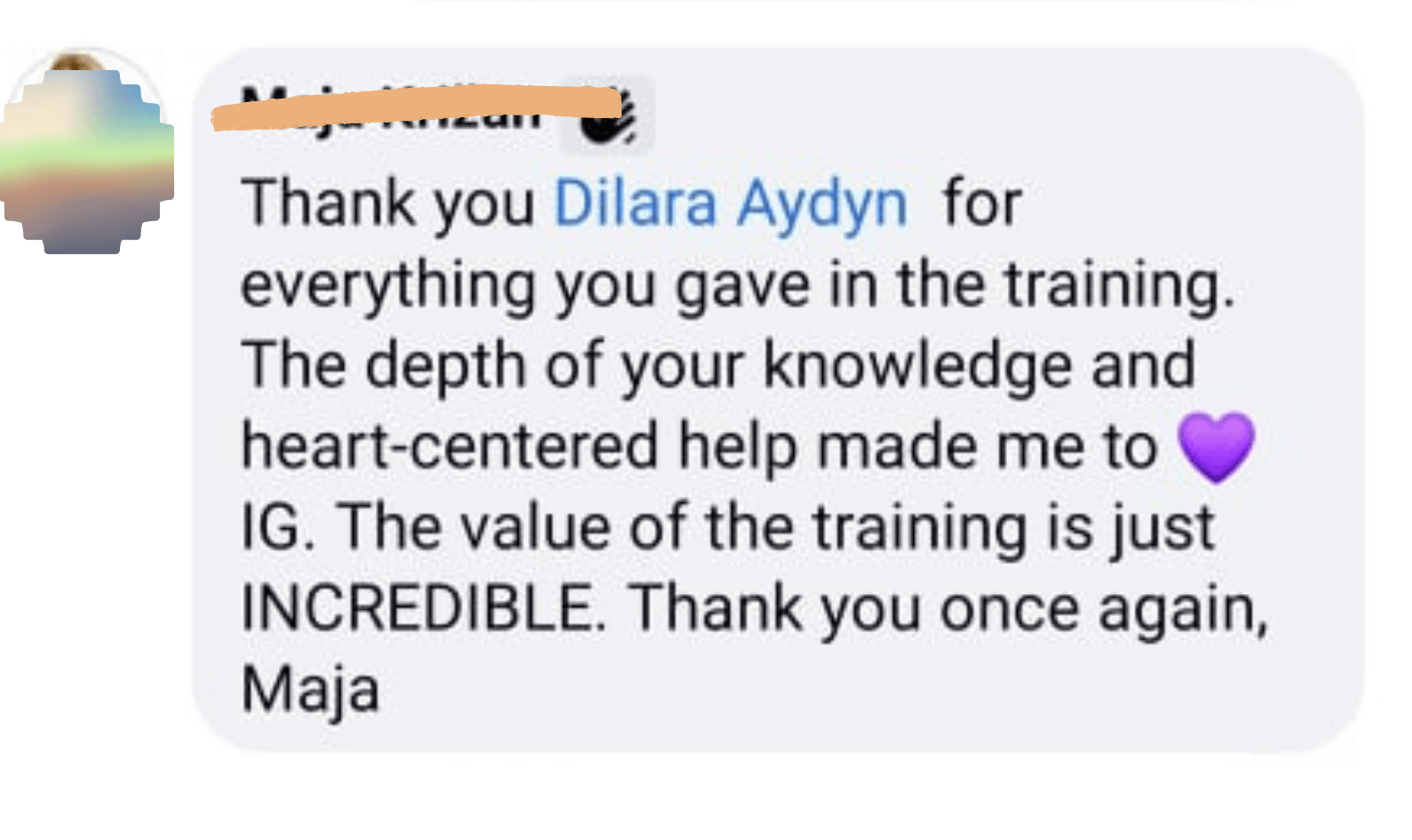““Dilara is extremely present, and friendly and explains things in a very simple way” Nora Amb, Life Coach
