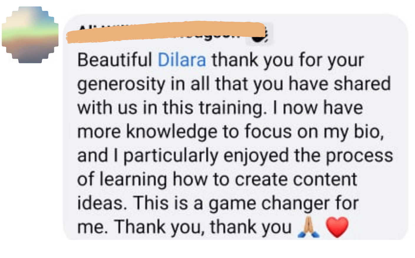 "Thank you DIlara for the amazing sessions that you gave us during the five days challenge where, you didn't make it complicated. All was very easy to follow through"  Stella Ilhenacho, Mindset Coach