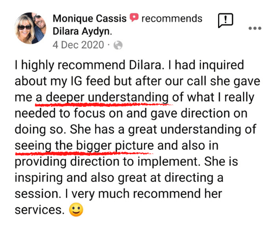 "So if you are trying  to build a business or be successful in any other way on Instagram, I would really recommend working with Dilara because I've not come across anyone else so far who could teach Instagram the way she does" Martina Booth, Jealousy Coach