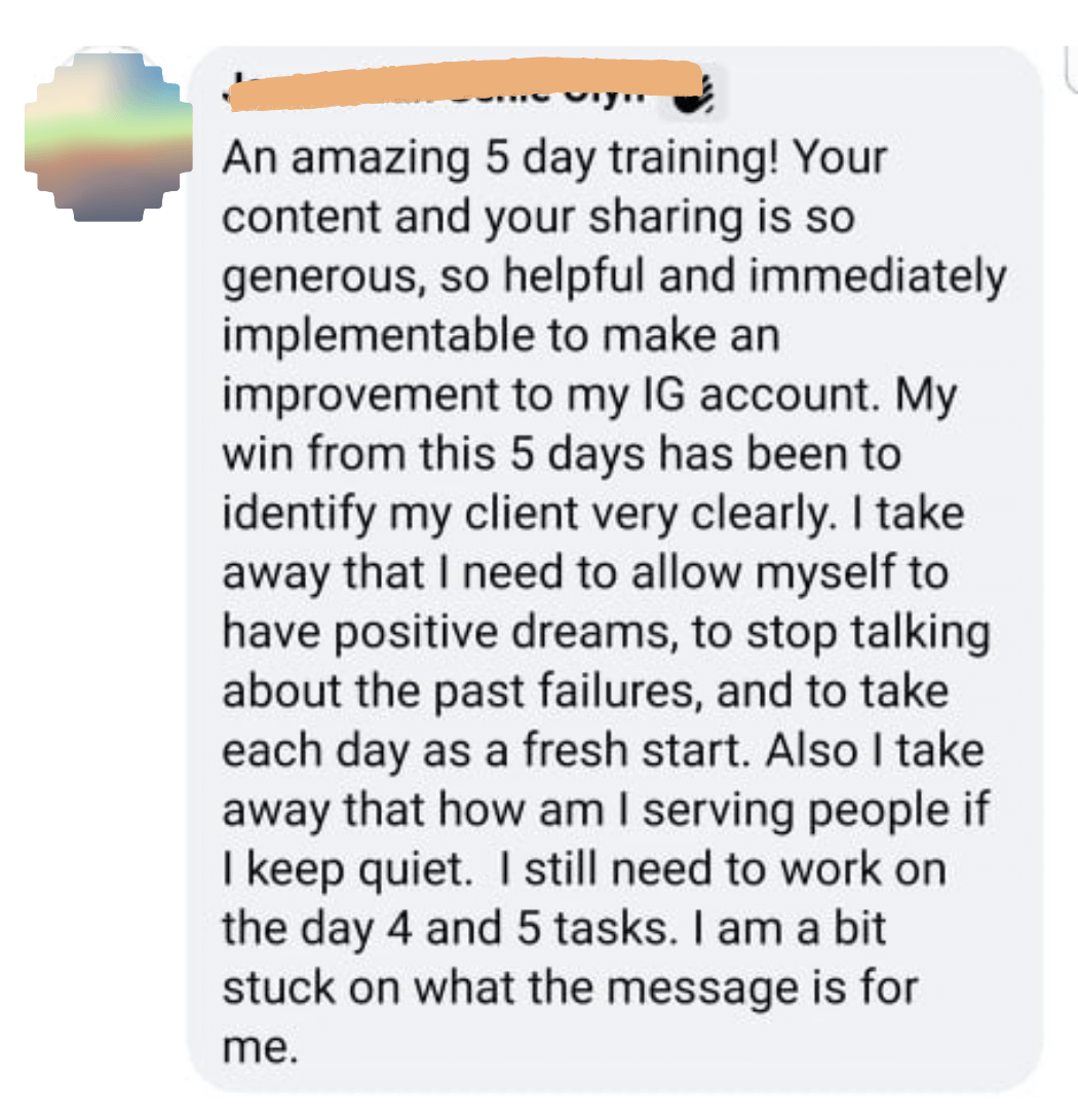 “I couldn’t wait for the next day’s lesson. She helps you put things into motion, so that you are not just doing nothing with your amazing account. Such a powerful experience” Sharon Keathley, Nursepreneur