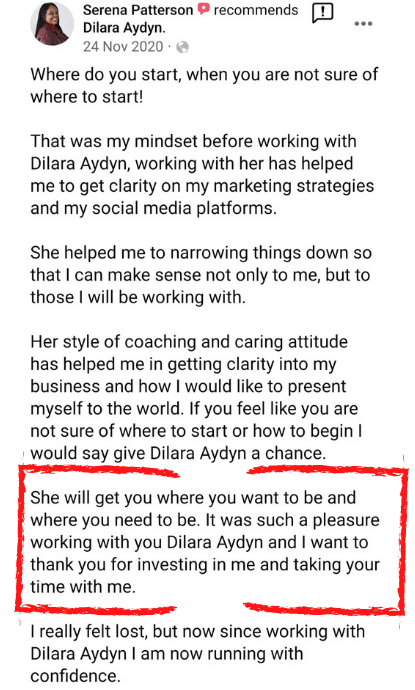 "I did an Instagram challenge with coach Dilara, and I would love to hire her as a coach." Dineisha Goodard, Lead Generation VA